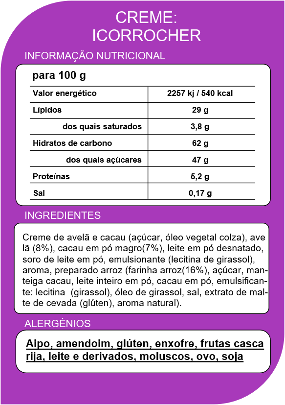 Creme / veteado com pedaços, sabor a chocolate e avelã com crocante, pronto a usar. Ideal para decoração e confeção de gelados, decoração de crepes, waffles ou panquecas. Também pode ser utilizado como recheio.